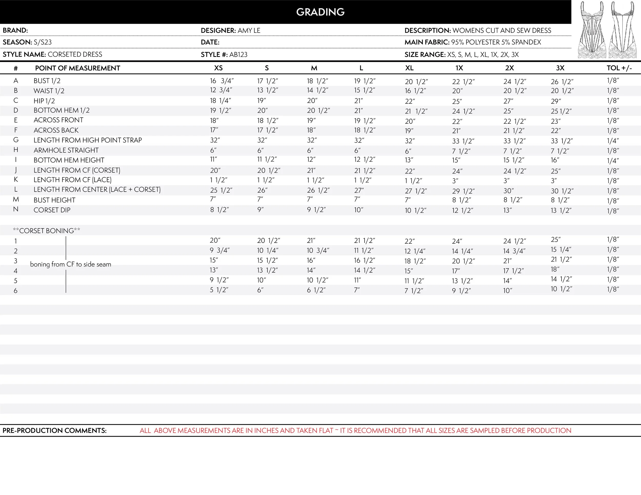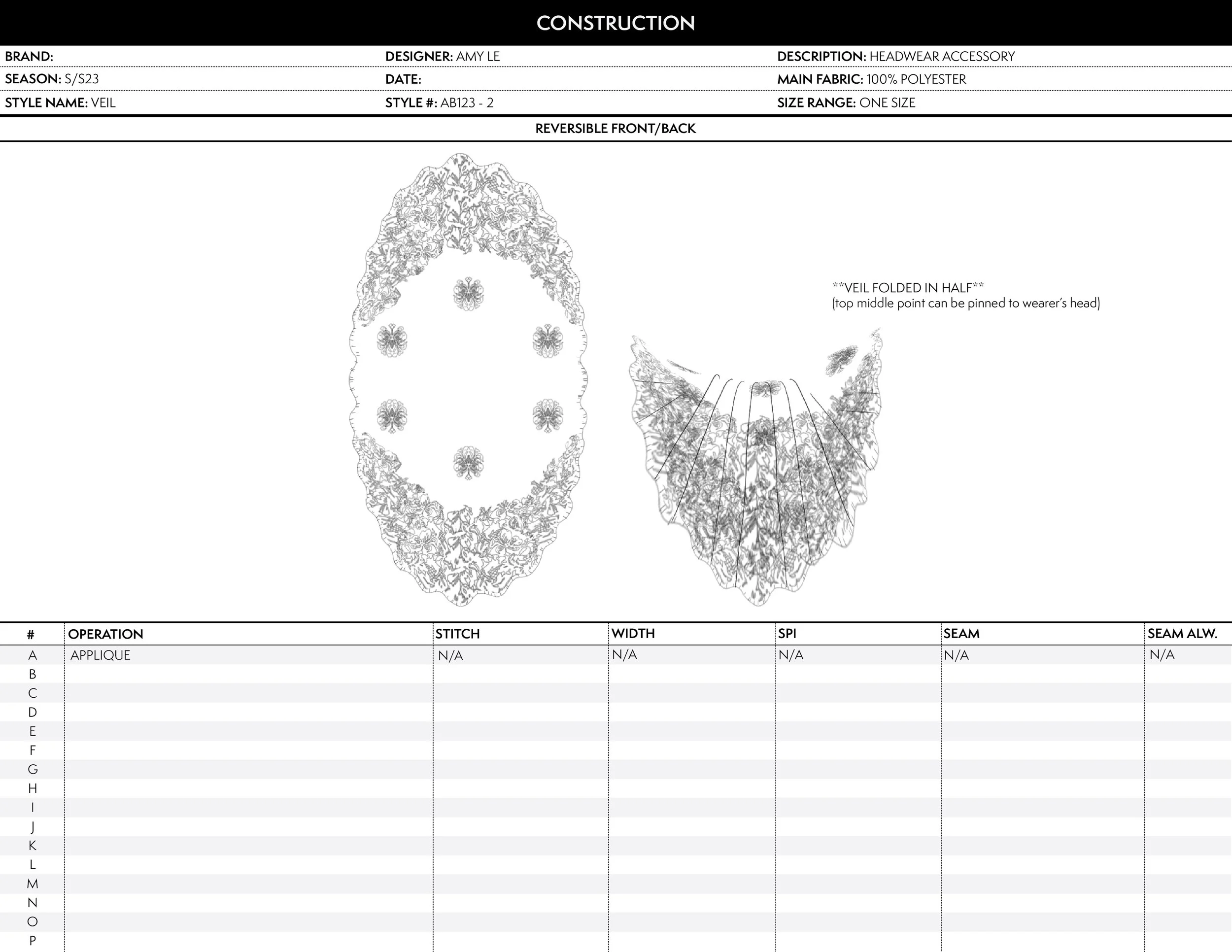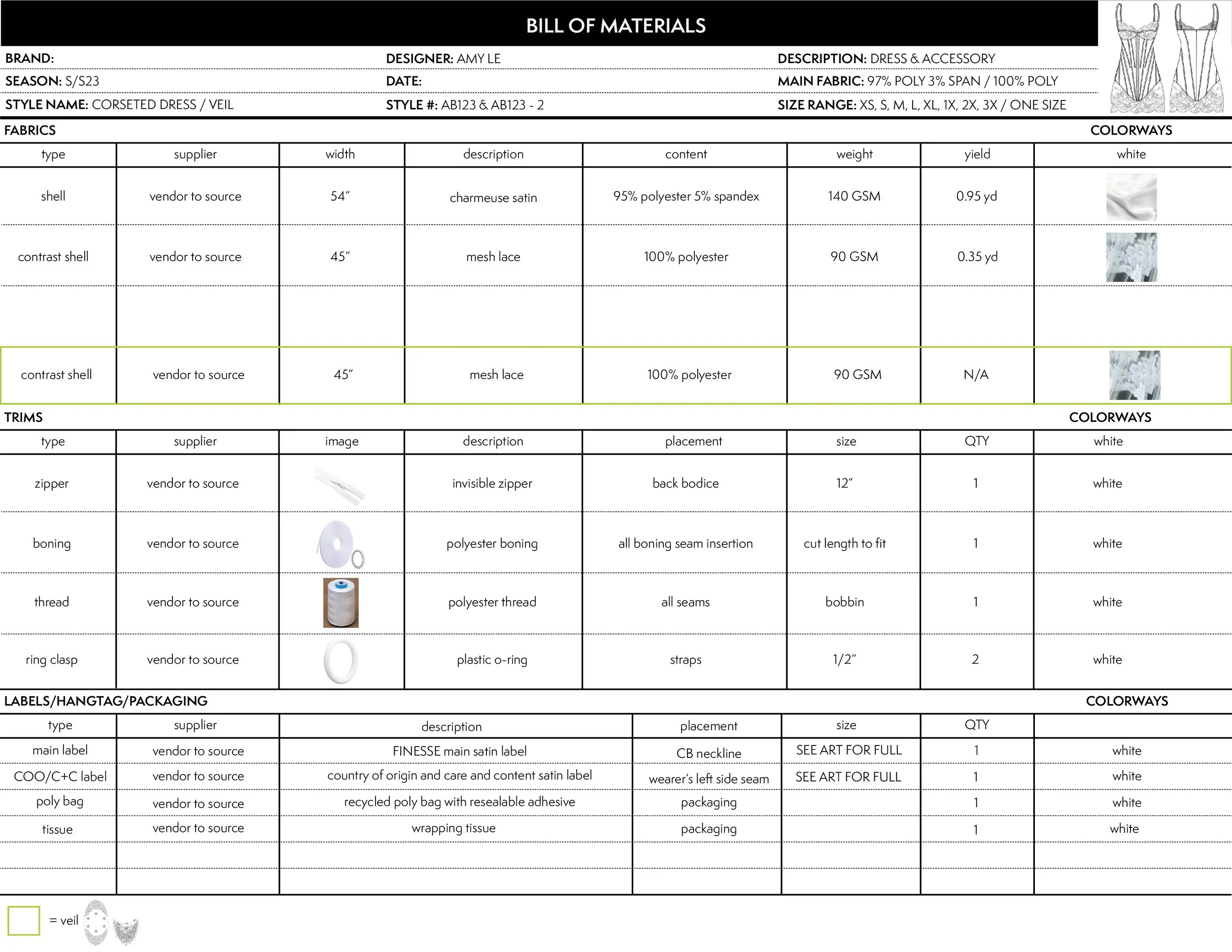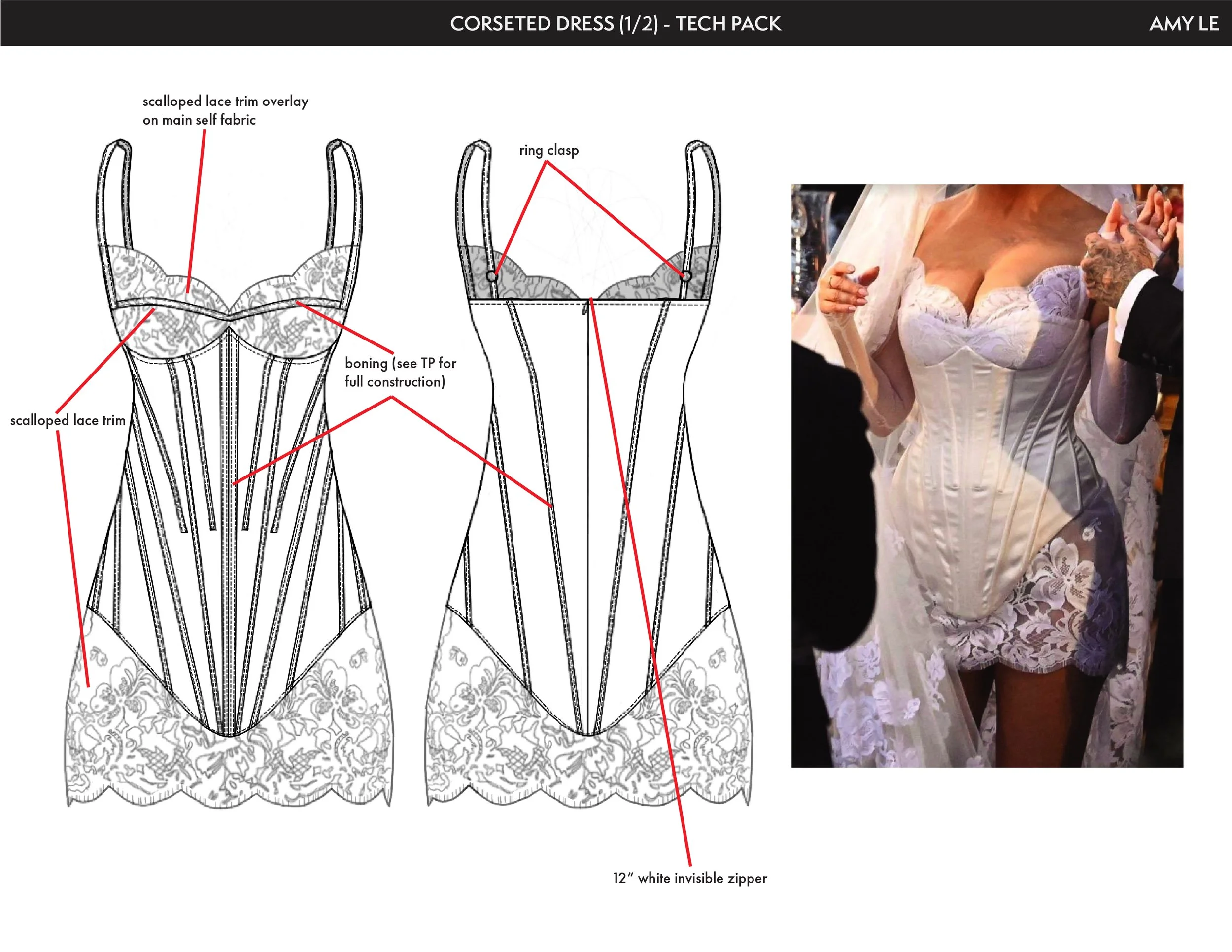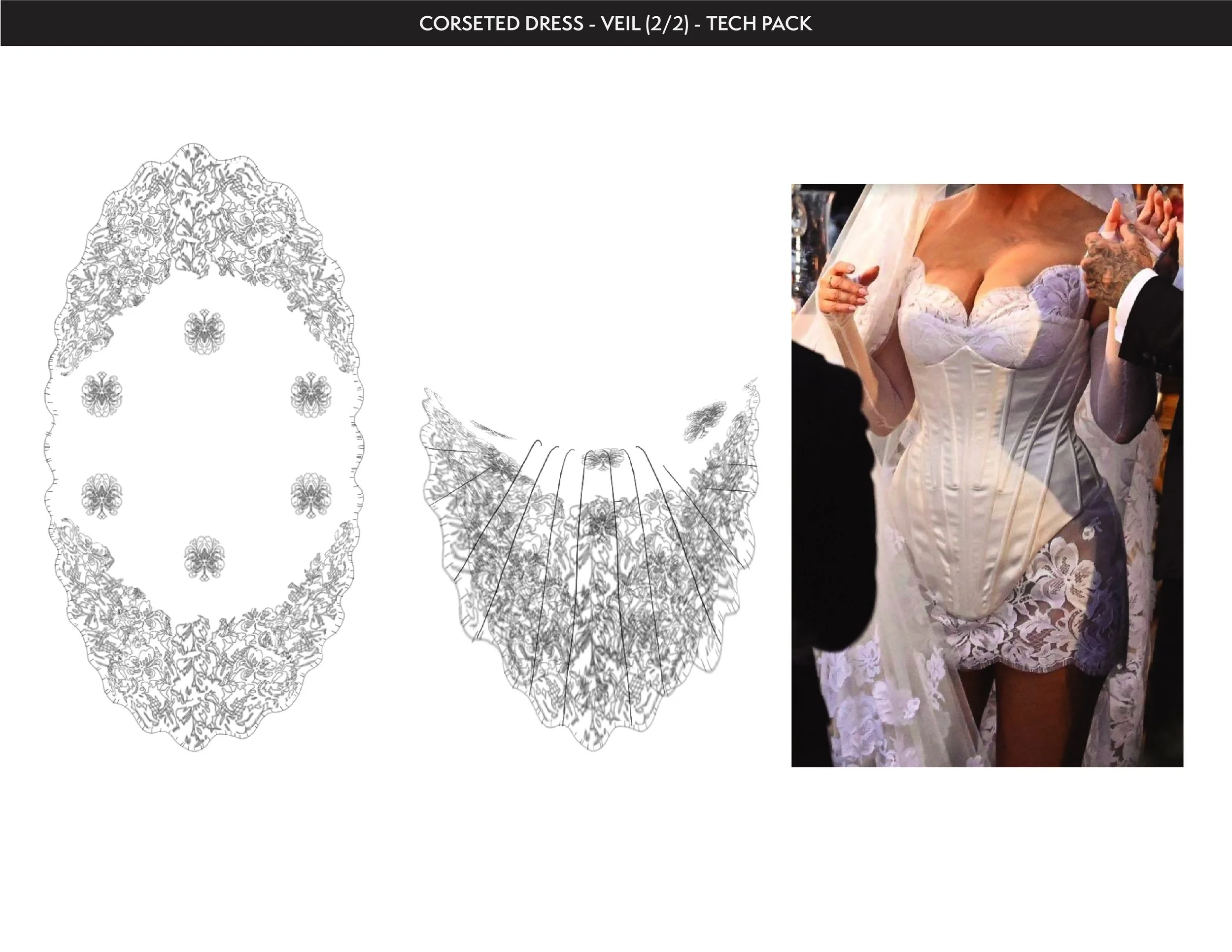 Sample tech pack of corseted dress and veil. Additional pages of calendar project dates and problem-solving designs in practice. Created in 2023.
